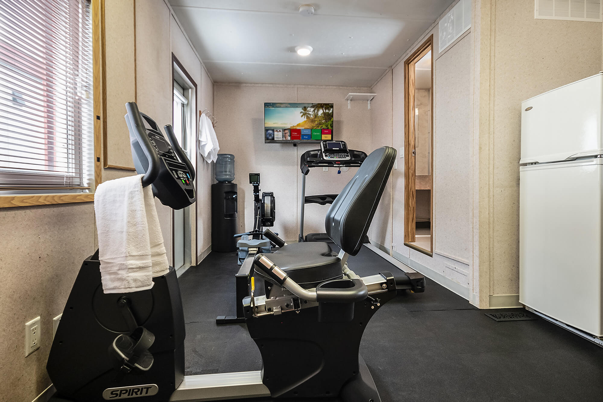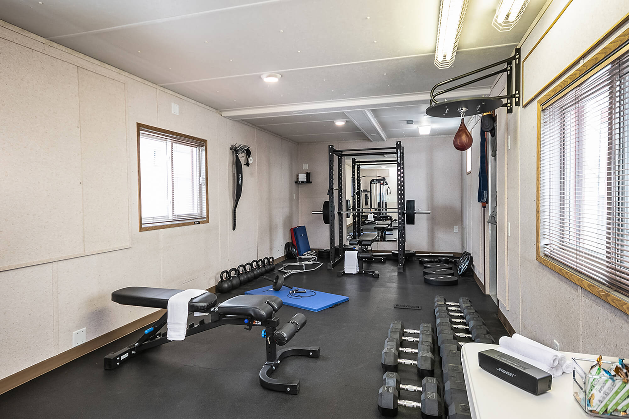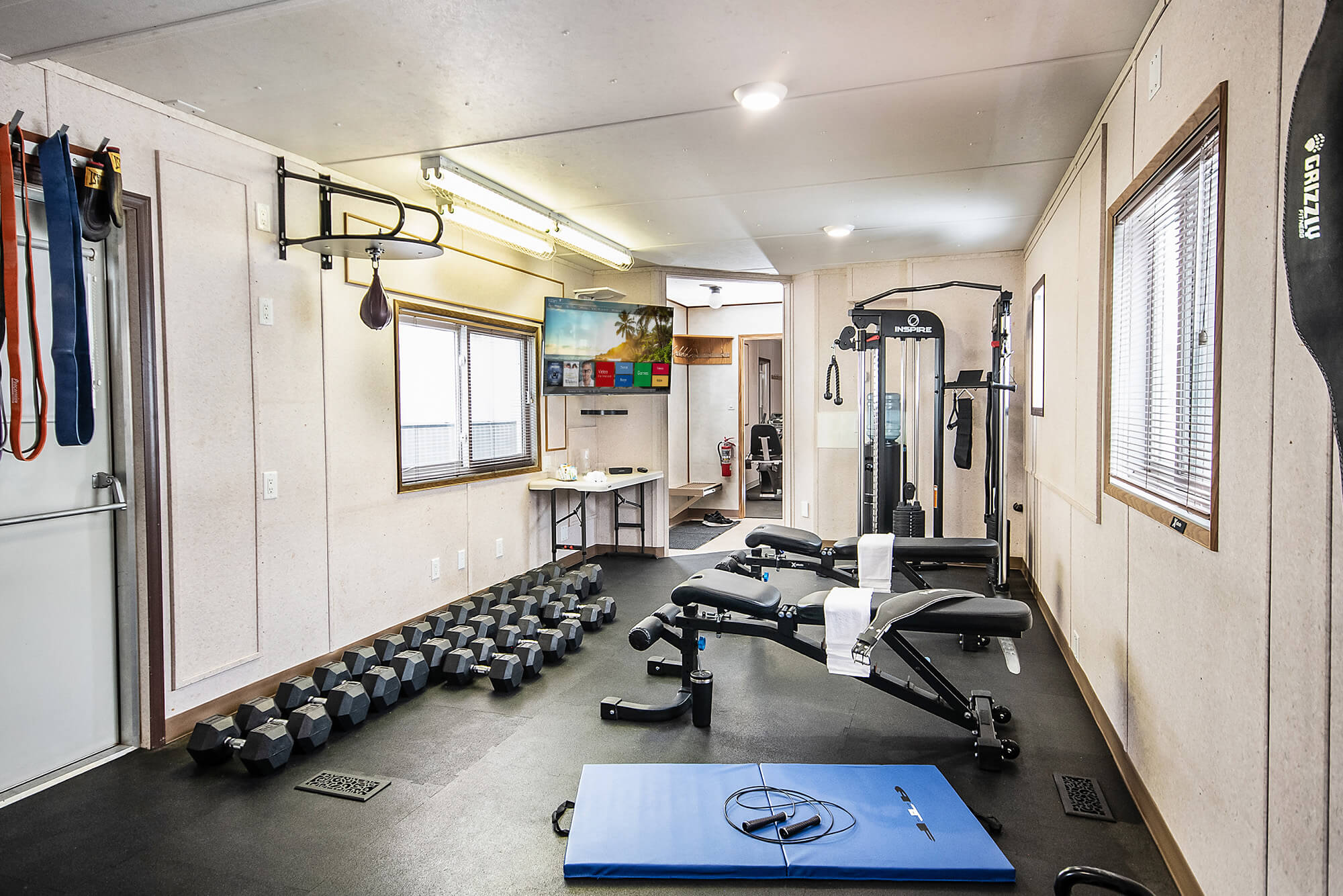 This wellsite trailer has been highly customized to provide a state-of-the-art workout facility for your employees. Gym equipment includes a treadmill, rowing machine, recumbent bike, universal gym, squat rack and bench press. There is also a large selection of free weights, kettlebells and a speed bag.
