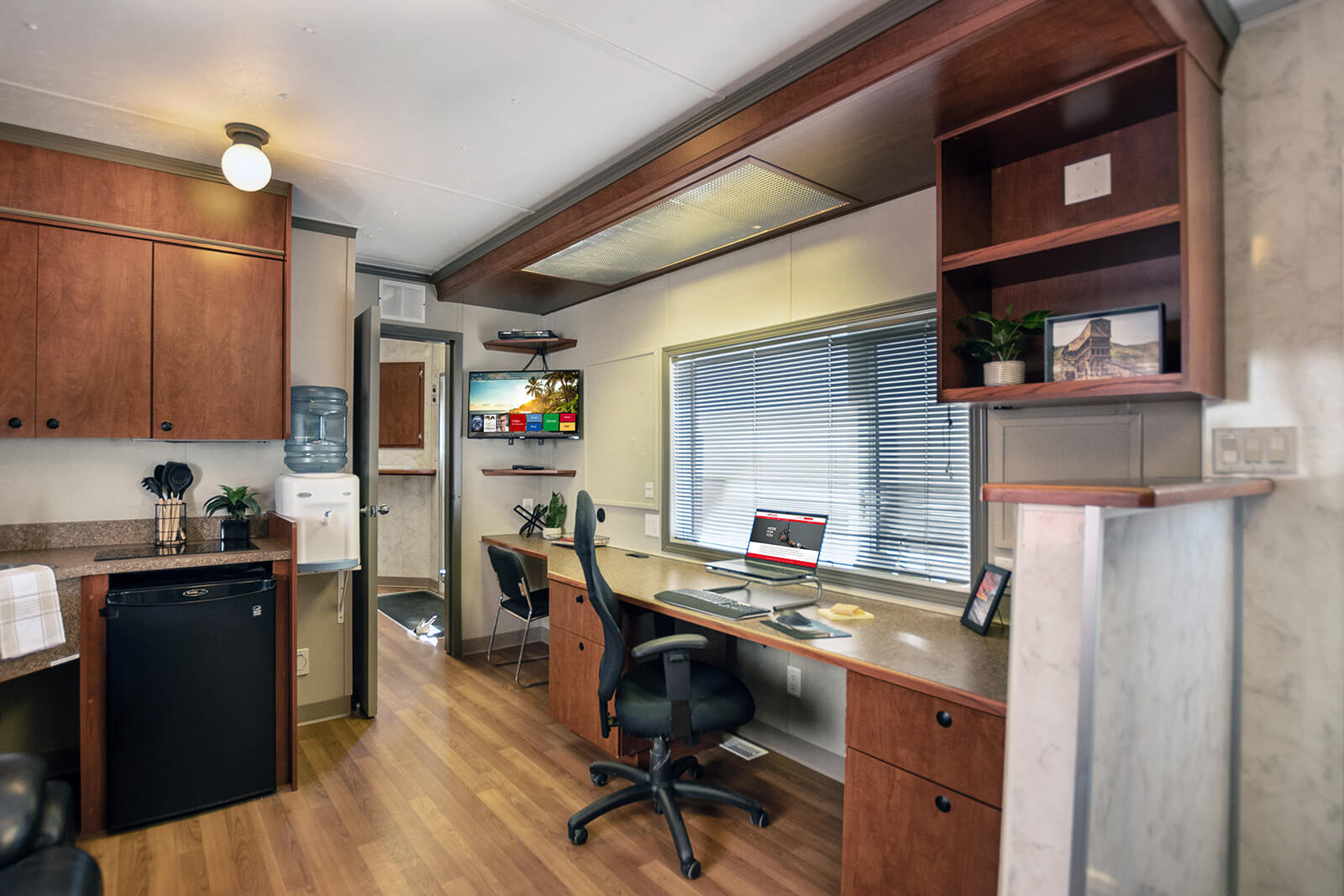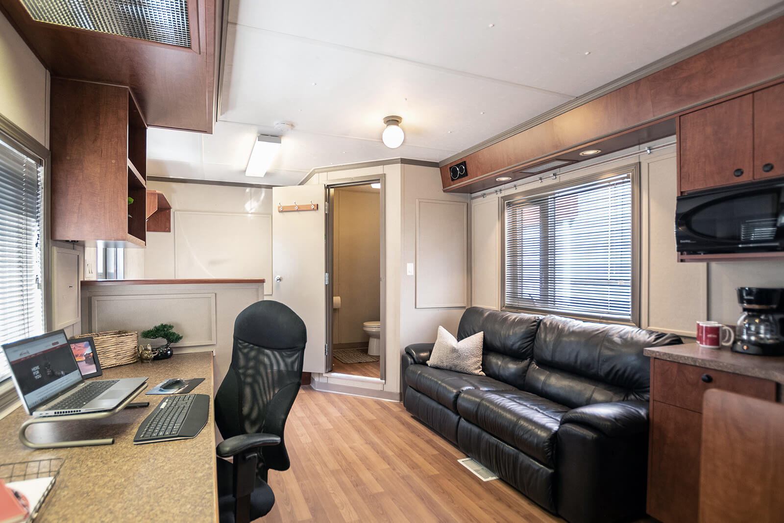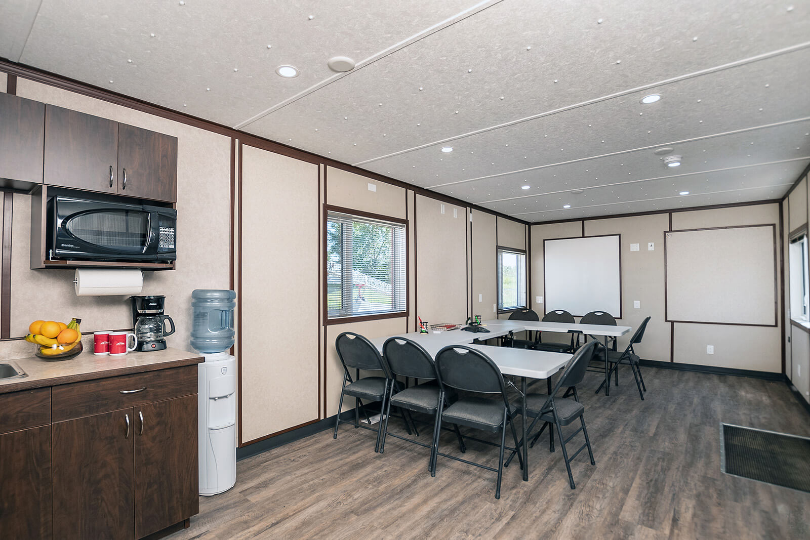 This wellsite trailer has been customized and contains two separate work areas. On one side there is a large open room that can be used as a workspace or meeting area (4 tables and 20 chairs included). The room can comfortably fit four 6’ tables with seating or 20+ people standing and has been used for morning or safety meetings or for multiple workspaces. This side has a small kitchen area including a refrigerator, sink and microwave. On the other side there is an office with a large desk/work area, couch and bathroom.